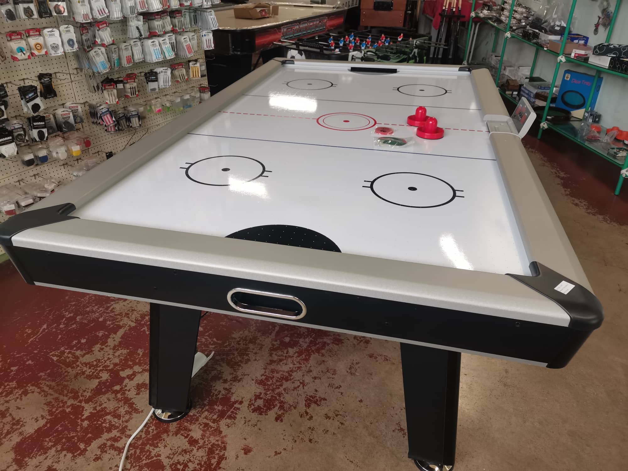 O novo air hockey Dominator da Buffalo tem outro design completamente inovador; uma mesa elegante e fina de 7 pés com um contador de pontuação pop-up lindamente integrado (eletrônico). Este modelo aberto dá uma sensação mais espaçosa.